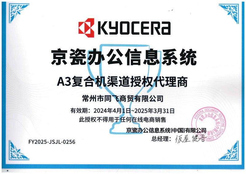 公司取得了日本京瓷復(fù)印機(jī)、打印機(jī),映美針式打印機(jī)、天威耗材、安興紙業(yè)等眾多知名品牌常州地區(qū)代理權(quán)。